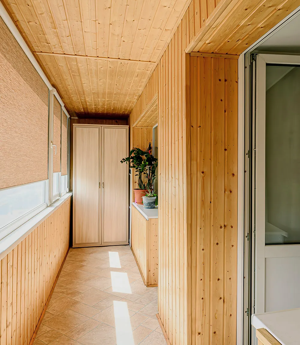 На закрытом балконе также можно использовать ПВХ-панели. Из плюсов этого бюджетного решения: легкий монтаж, влагостойкость, простой уход. Главный минус — хрупкость при температуре ниже -10 °C.