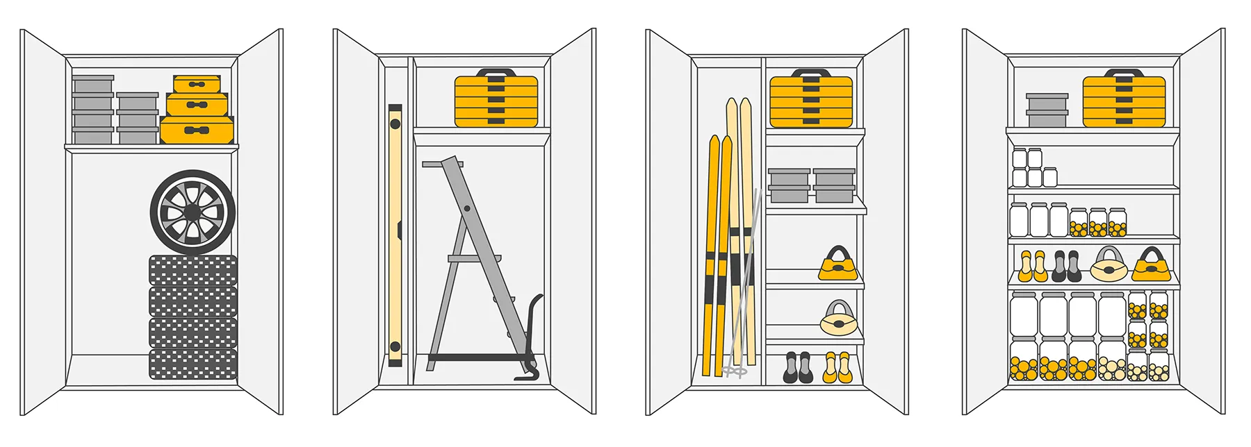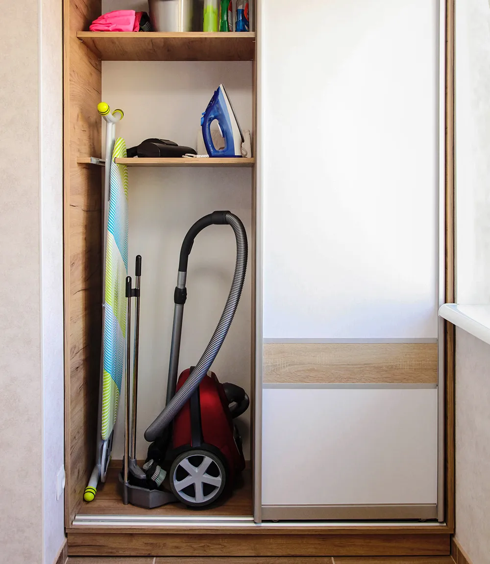 - Отсек без полок (в высоком шкафу) — подходит для длинных предметов: лыж, швабр, лопат или стремянки.