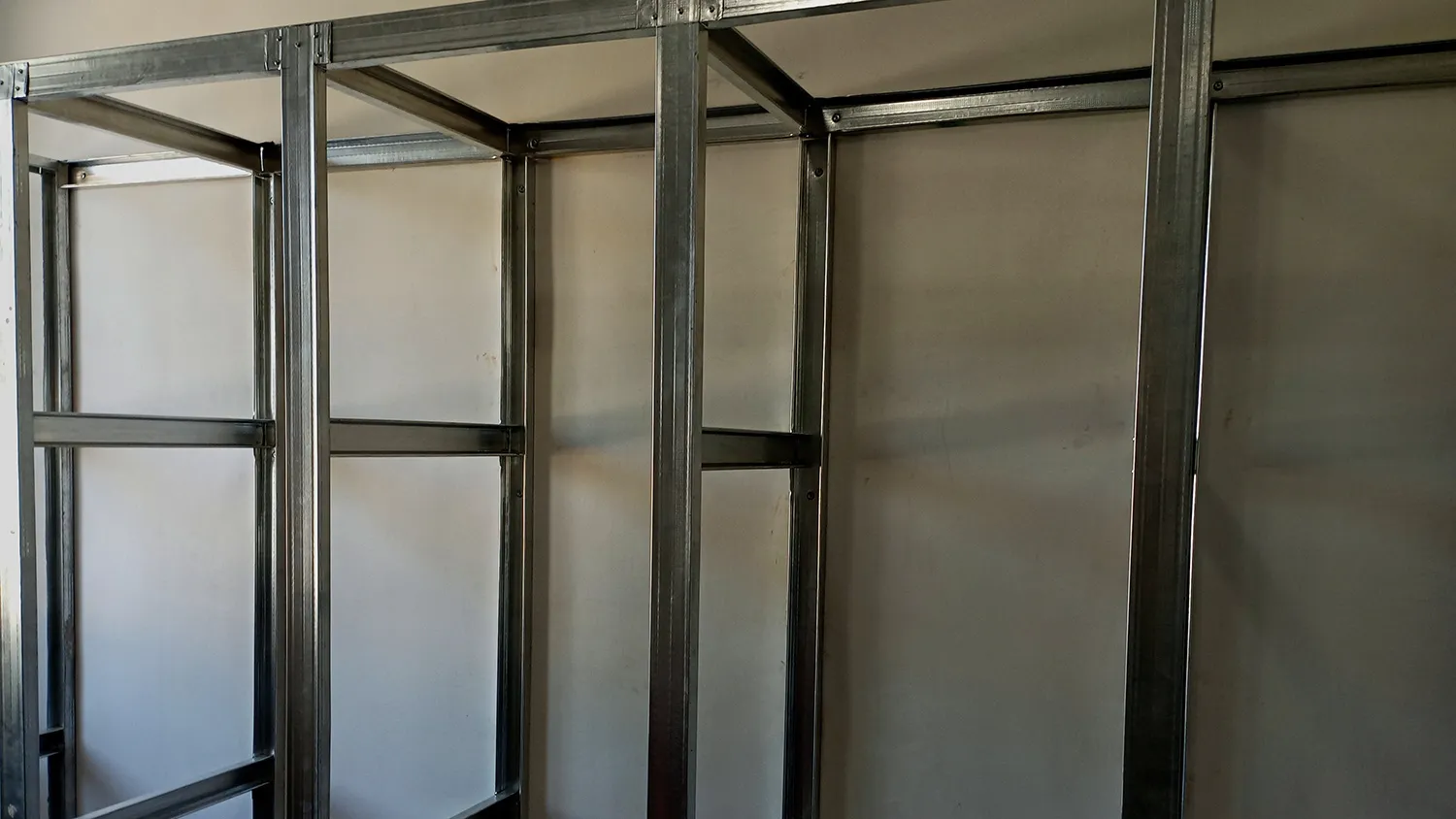 Проделайте этот этап и с задней стойкой. Для надежности можно дополнительно зафиксировать низ и верх стоек на полу и потолке металлическими уголками на дюбели или анкеры. Измерьте рулеткой расстояние между стойками внизу, посередине и вверху. Значения должны совпадать.