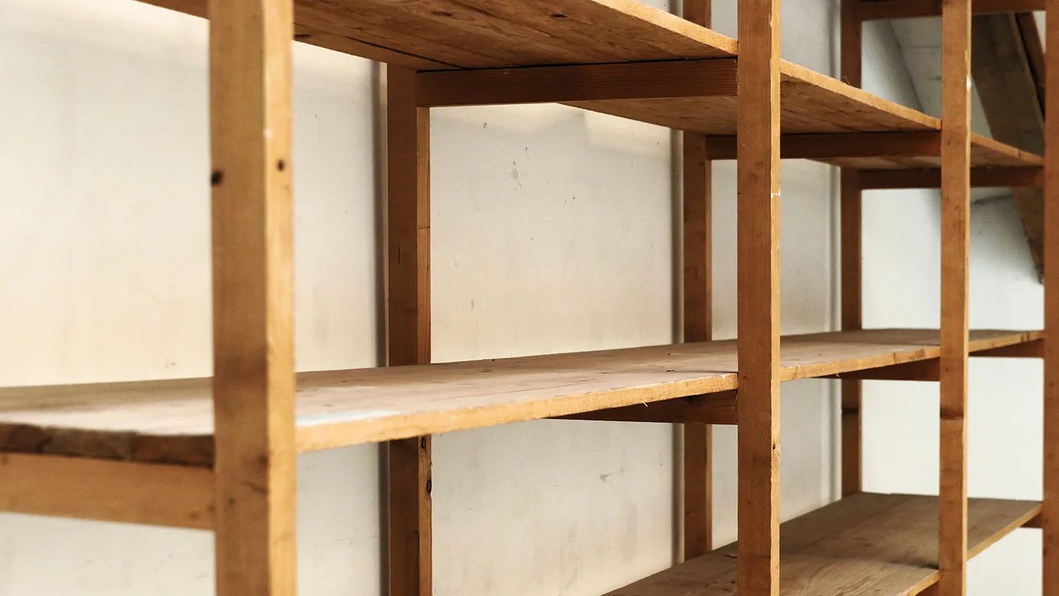 Между стойками отметьте уровни будущих полок и верхней перекладины. Закрепите поперечные бруски на стене. Можно дополнительно усилить соединение небольшими металлическими уголками по одному в каждом углу.