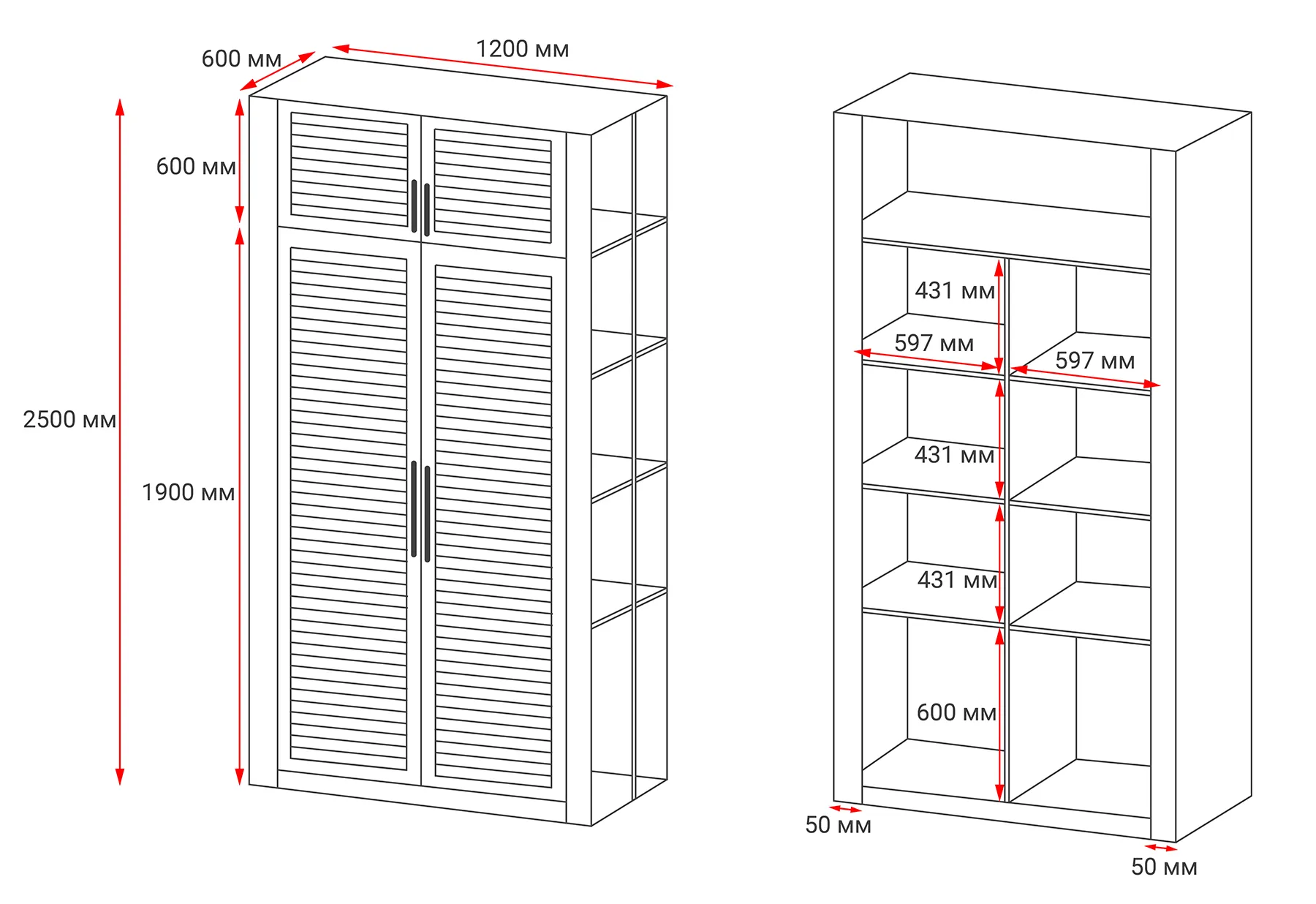 Снятые размеры переносят на чертеж. Его можно сделать на бумаге от руки или в онлайн-конструкторе. На схеме обозначают высоту, ширину, глубину шкафа, отмечают расположение дверей и полок, их размеры.