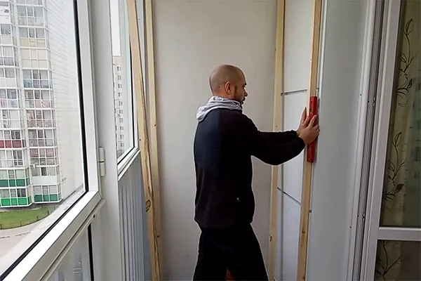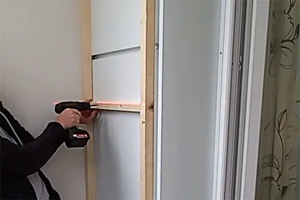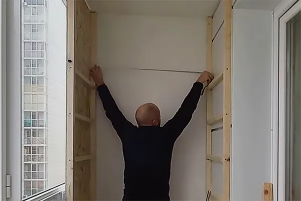 Выставьте собранную стенку по уровню напротив первой. Измерьте рулеткой расстояние между ними внизу, посередине и вверху. Эти значения должны совпадать, тогда двери с полками встанут без перекосов. Крепление напрямую к внешней стене балкона не выполняют ― шкаф будет держаться за счет собственного каркаса.