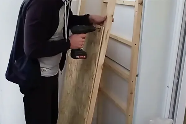 Закройте боковые стойки фальшпанелями и закрепите на саморезы с внутренней стороны через брус.