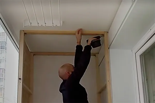 Чтобы сделать шкаф на балкон или лоджию, понадобятся четыре вертикальные стойки определенной ранее высоты для каркаса и еще одна или две для разделения конструкции на секции по ширине. Если требуется зонирование по высоте (например, на верхние и нижние секции), разделение выполняют с помощью горизонтальных опор, закрепленных между стойками.