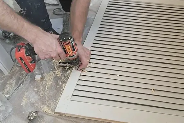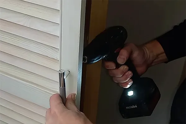 Определите количество и расположение петель. В варианте с жалюзийными дверцами достаточно двух на каждую створку. Если они выше 1,2 м, добавьте третью в центре для надежности. Отступите 10–15 см от верхнего и нижнего края и поставьте точки под петли. Приложите их к разметке, выровняйте по кромке и зафиксируйте шуруповертом на саморезы.