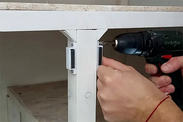 Прикрутите шуруповертом на короткие саморезы 3×12 мм магнитную защелку к центральной стойке шкафа. Ответную часть — к внутренней стороне створки. Проверьте, чтобы двери фиксировалась с легким щелчком, но без усилия.