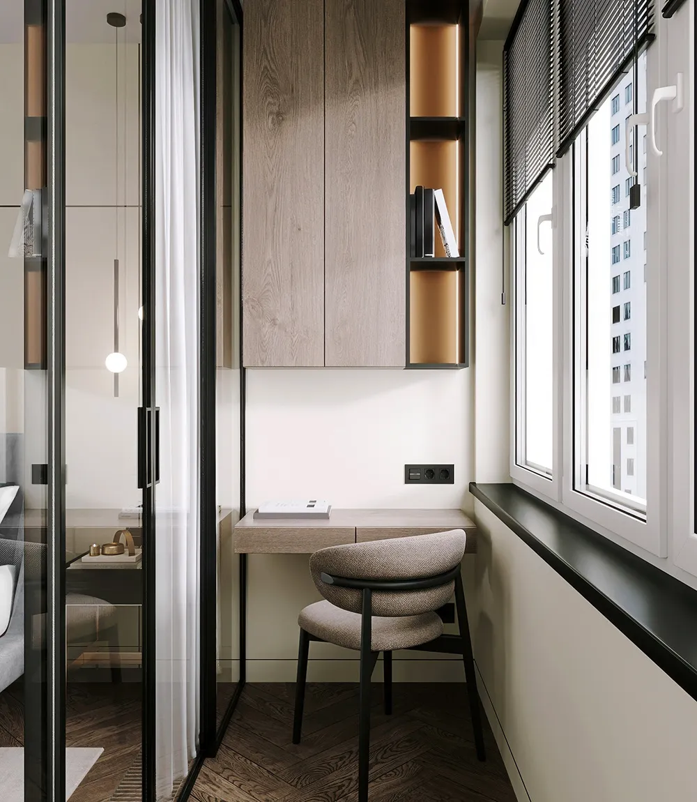 - На теплом балконе можно красиво обустроить кабинет с письменным столом и подвесным шкафом для документов или книг.