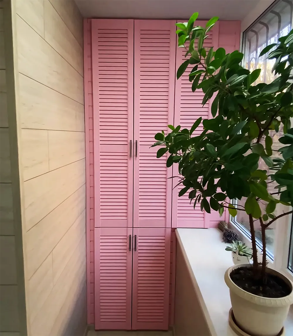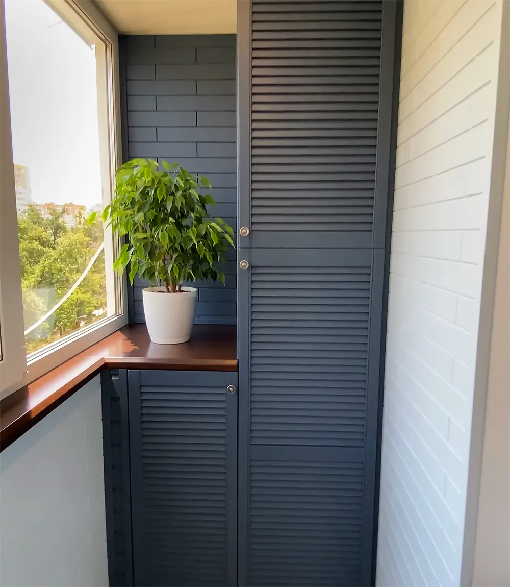 Балкон может выполнять роль как хозяйственной зоны, так и места отдыха. Шкаф встраивается в эту логику. Он либо помогает организовать хранение, либо становится частью интерьера. Вот несколько примеров: