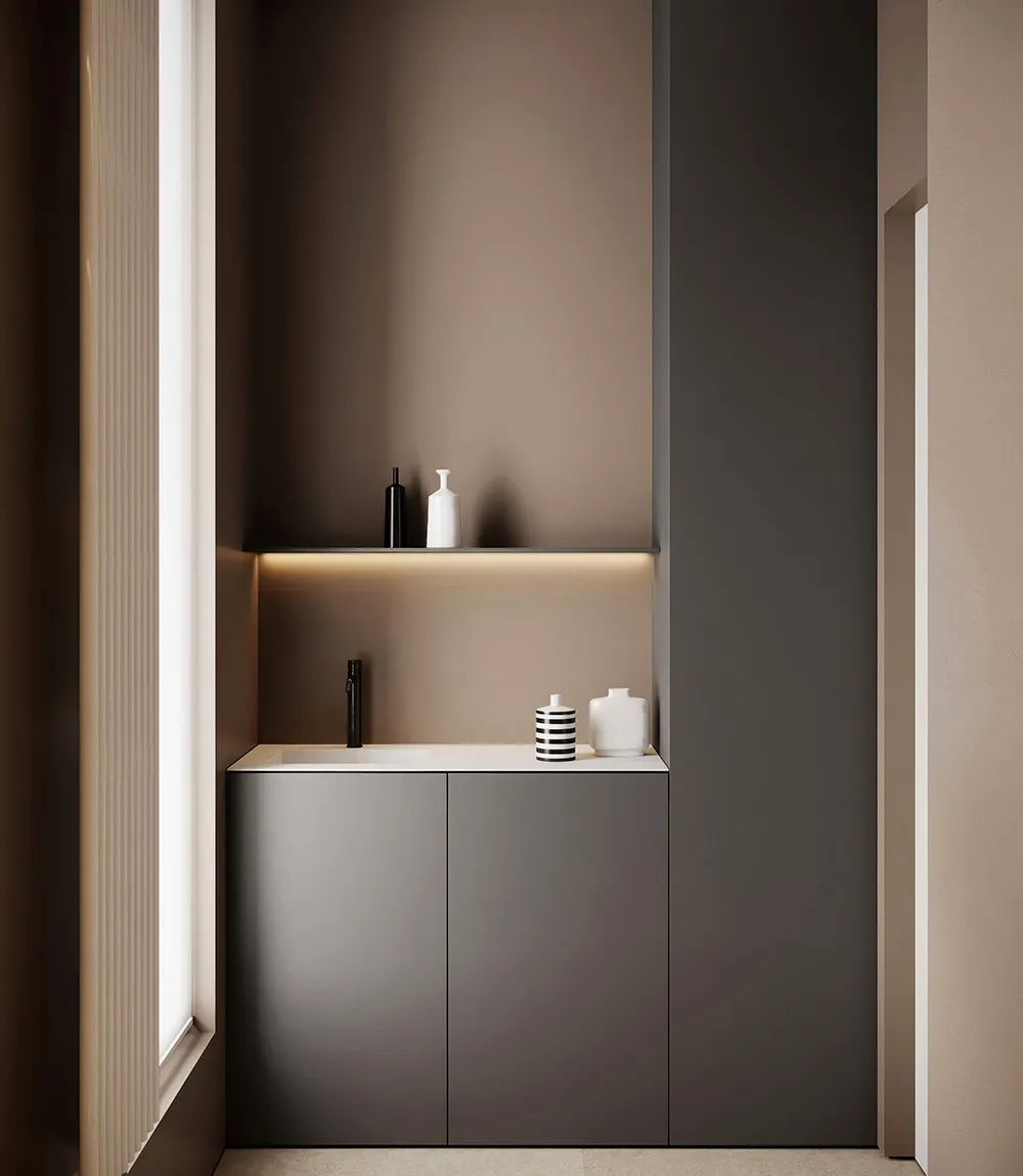 Цвет балконного шкафа лучше подбирать с учетом освещения и функции зоны. На солнечной стороне предпочтительны ненасыщенные, приглушенные оттенки: серый, оливковый, пыльно-голубой, теплый белый. Яркие или глянцевые поверхности быстро утомляют глаз при прямом свете и выгорают. На тенистых или северных балконах, наоборот, уместны светлые, слегка теплые тона: молочный, беж, светлое дерево. Они оживляют пространство без искусственной яркости.