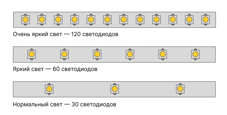 Мощность ленты для комфортного света — от 5 до 10 Вт/м. Если взять меньше, то свет будет скорее декоративным, чем функциональным, а если больше, то он получится слишком ярким и некомфортным.