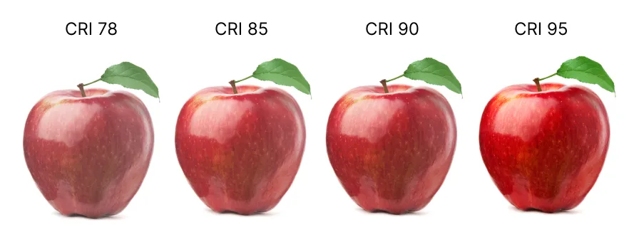 Свет в зоне приготовления пищи должен быть приближен к естественному утреннему свету — при таком освещении достоверность цветопередачи равна 100 %. У ламп способность достоверно передавать цветопередачу обозначается индексом цветопередачи (CRI), он указан в техническом описании или на упаковке. Для подсветки кухонной столешницы берите светодиодную ленту с CRI больше 90. Тогда цвет продуктов будет максимально соответствовать натуральному.