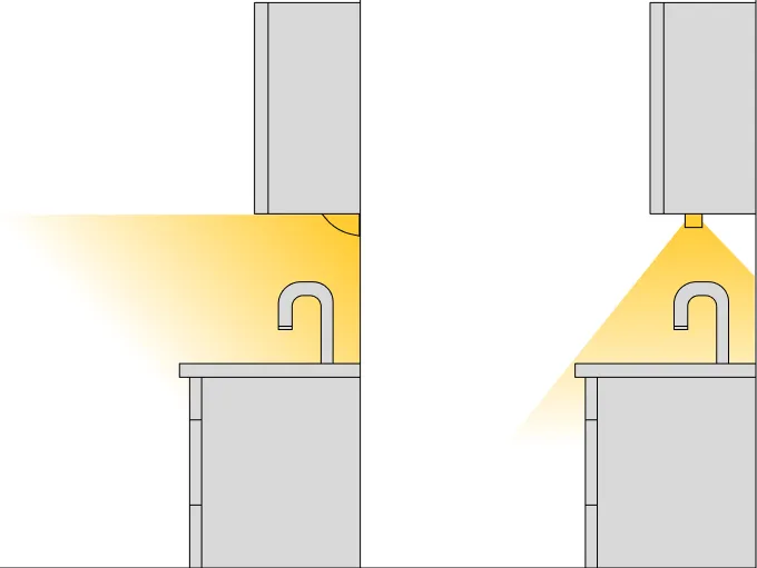 Минус такого решения: свет будет идти не строго вниз, а под углом, его сила и равномерность освещения столешницы ухудшатся.