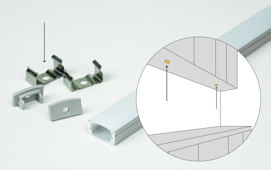 Также надо внимательно выбирать глубину профиля: если взять плоский профиль, то светодиодная лента будет лежать близко к рассеивателю и точки яркости будут видны. При глубоком профиле (от 12 мм) светодиодная лента окажется на расстоянии — света она будет давать столько же, а точек яркости видно не будет. Это повышает комфорт для глаз и выглядит более эстетично.