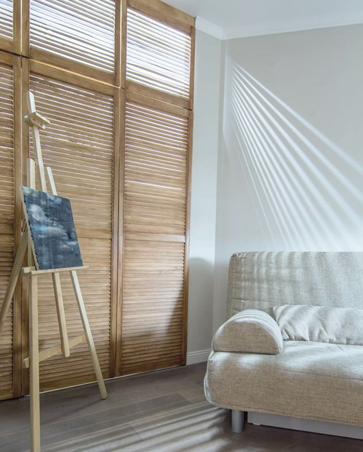 Светодиодные ленты обычно размещают внутри гардеробов с одеждой, но для поиска инструментов на глубоких полках в шкафу или кладовой они тоже будут полезны. А если сделать реечные дверцы, можно получить необычный эффект ставень, залитых солнцем.