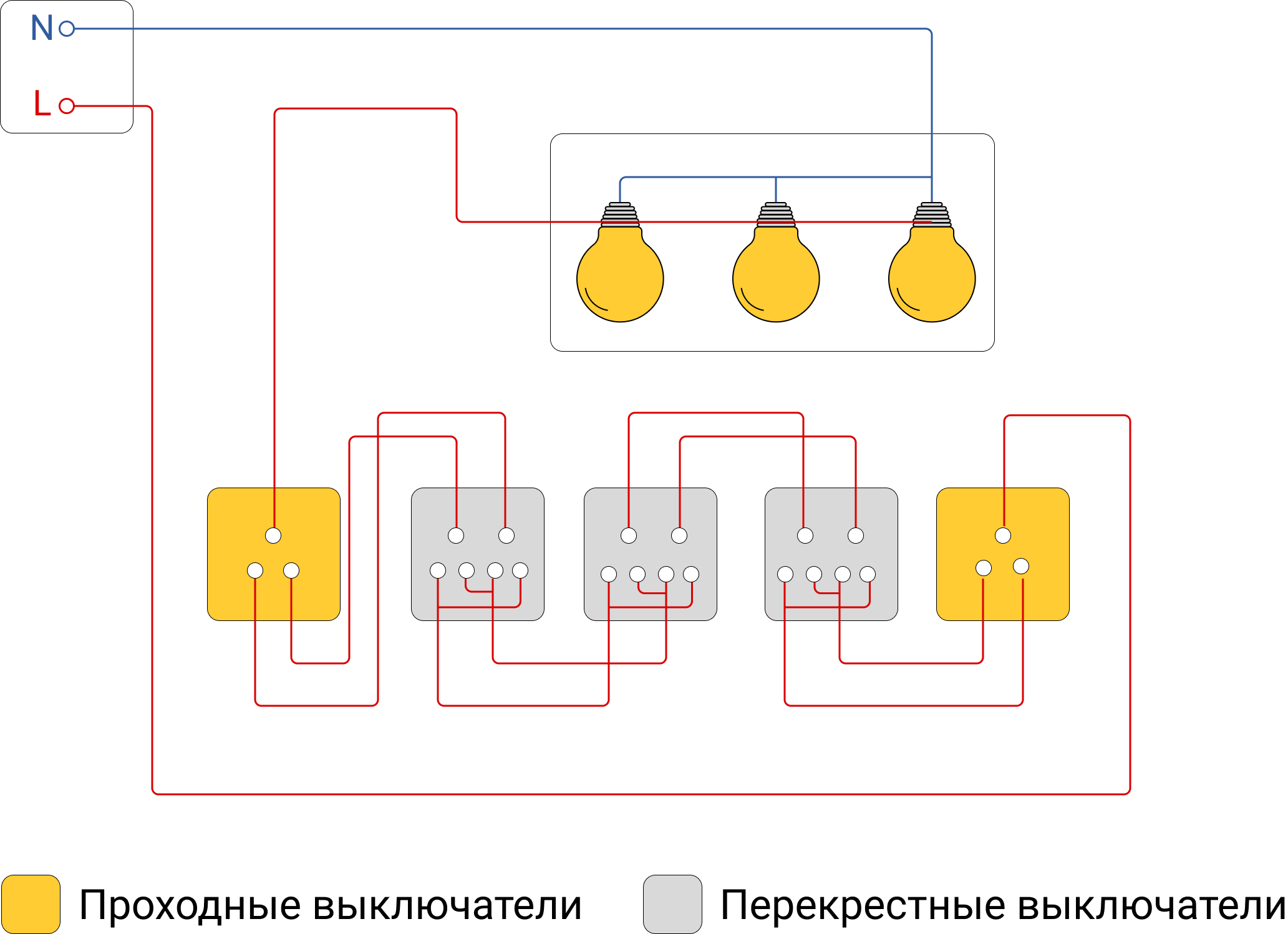 Схема подключения 5 выключателей для 5 точек управления светом