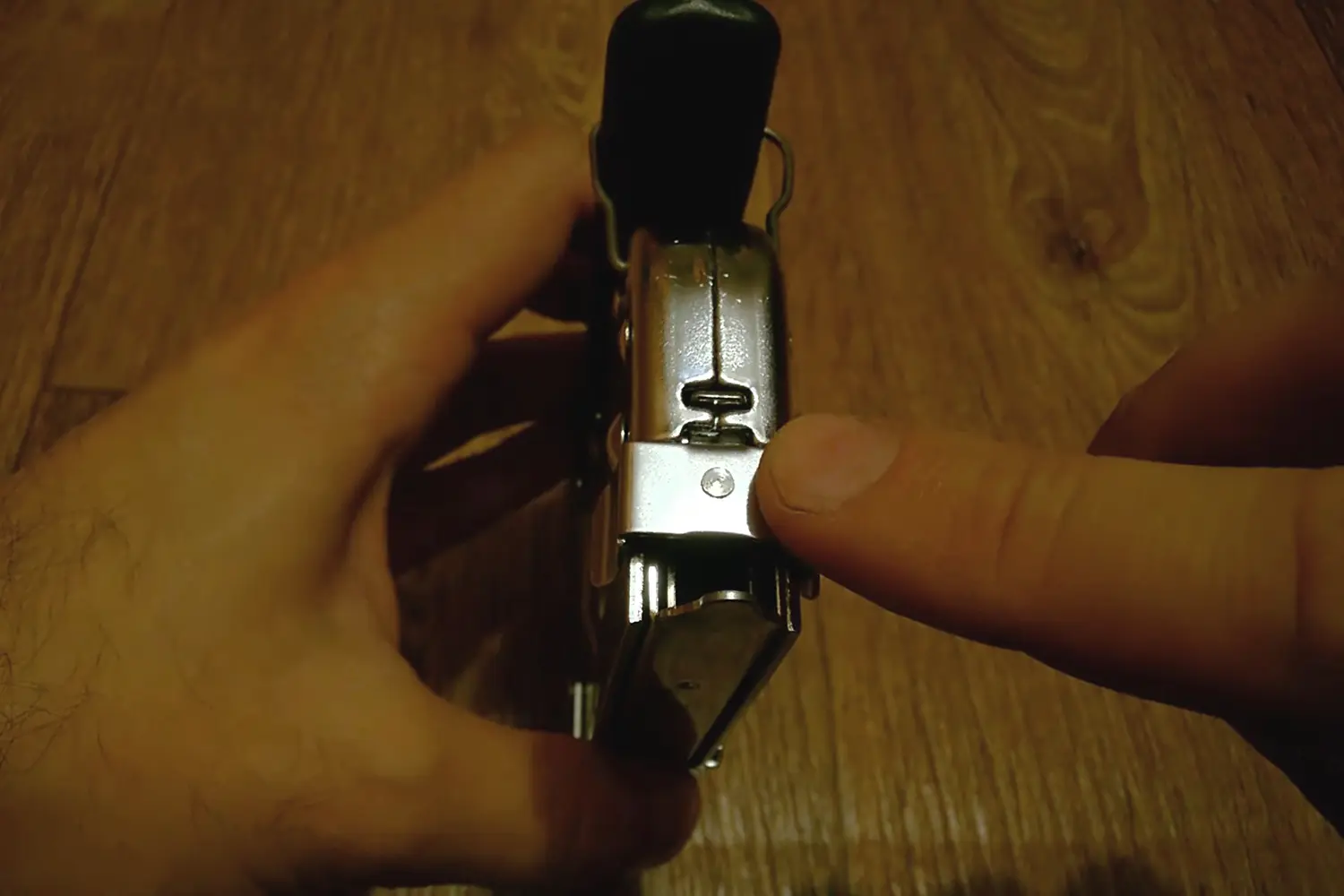 Вставьте прижимной механизм обратно до щелчка — он пройдет точно между скобами. Сделайте пробный выстрел в ненужную доску или другую подобную основу.