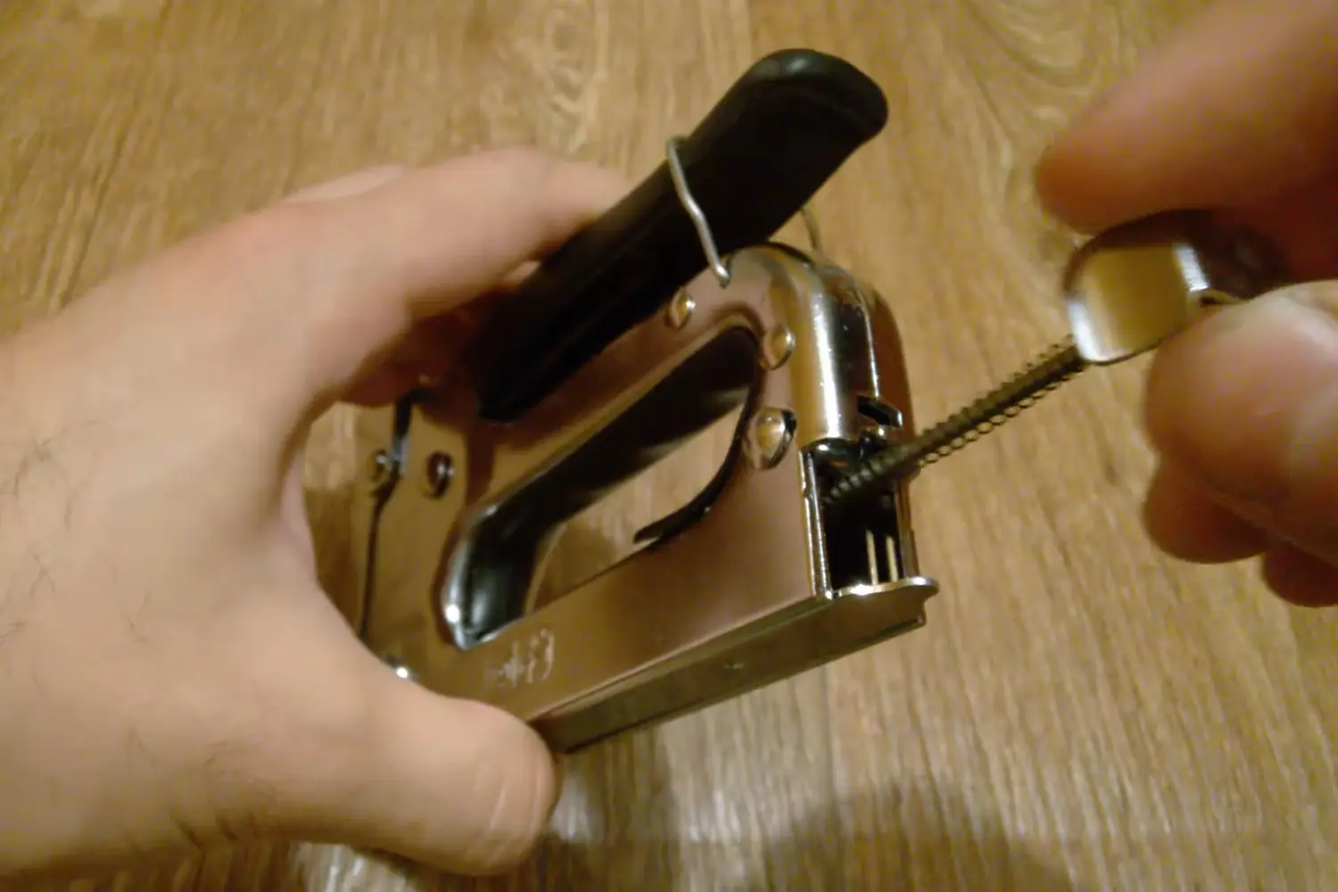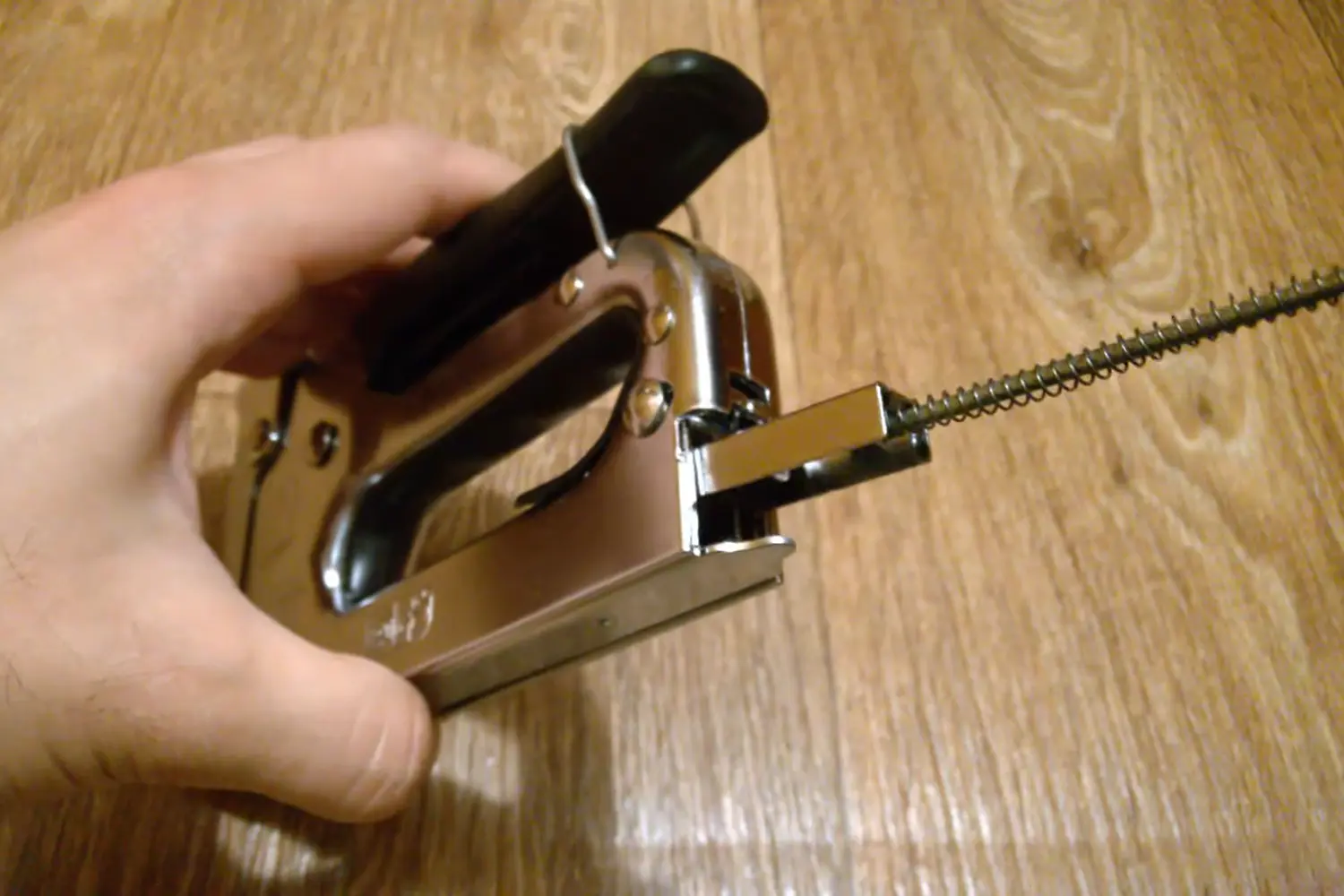 Если строительный степлер начал клинить сразу после заправки, не пытайтесь пробить затор повторными нажатиями на рычаг. Так вы только сильнее сплющите застрявшую скобу внутри, и вытащить ее без полной разборки инструмента станет невозможно. Сразу выньте толкатель и удалите дефектный фрагмент плоскогубцами.