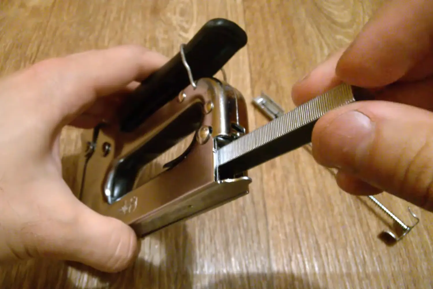 Проверьте, не остались ли в канале кусочки старой обоймы. Вставьте в магазин планку скоб ножками вниз, до упора.