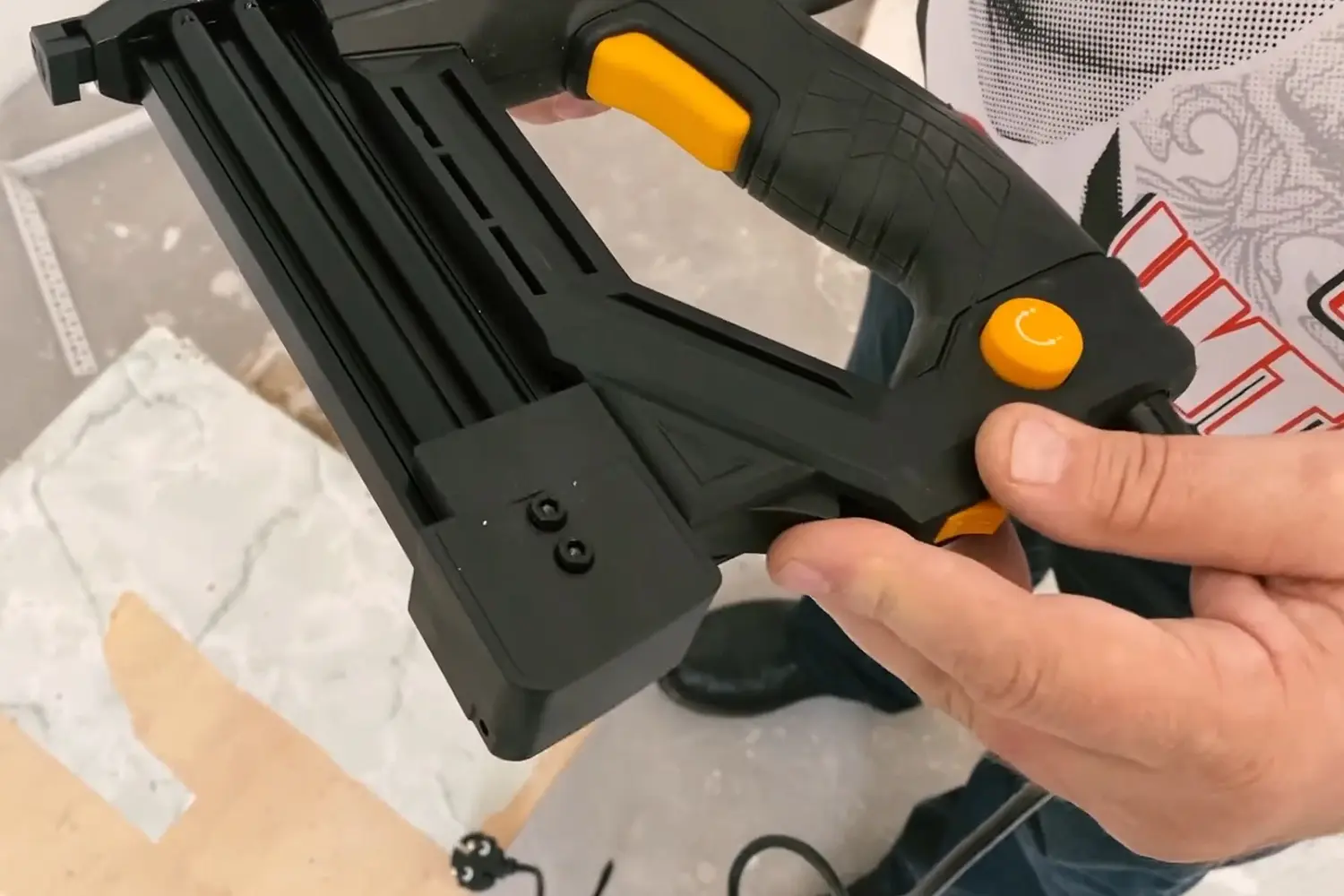 После заправки скоб подключите питание, снимите инструмент с предохранителя и сделайте тестовый выстрел в основу, с которой будете работать.