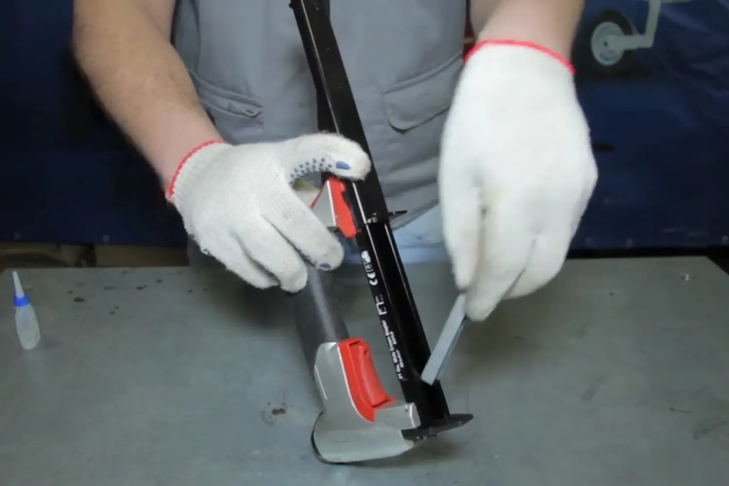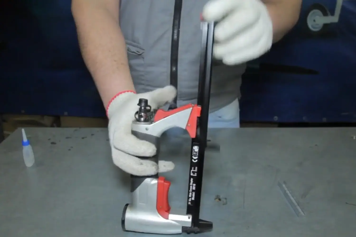 - Заправка без отключения инструмента. Это опасно, если модель электрическая или пневматическая. При закрытии магазина может произойти аварийный выстрел, даже если вы не нажимаете на спуск. И даже в механических моделях при закрытии магазина есть риск случайного срыва рычага, поэтому держите ладонь в стороне от выходного отверстия.