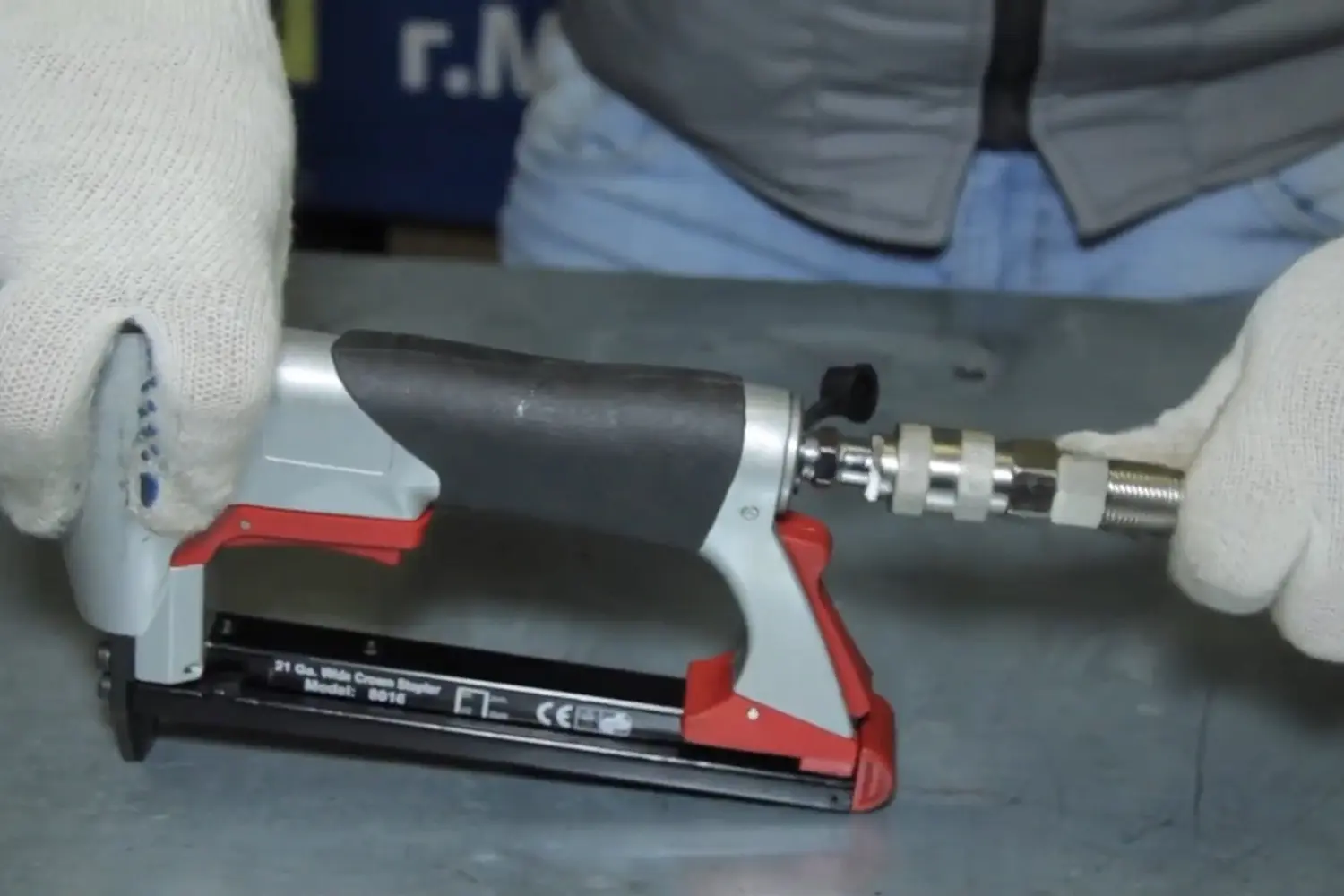 - На слух. Включите компрессор и подайте давление. Прислушайтесь к характерному шипению у соединения шланга со степлером ― даже небольшая утечка часто слышна в тишине.