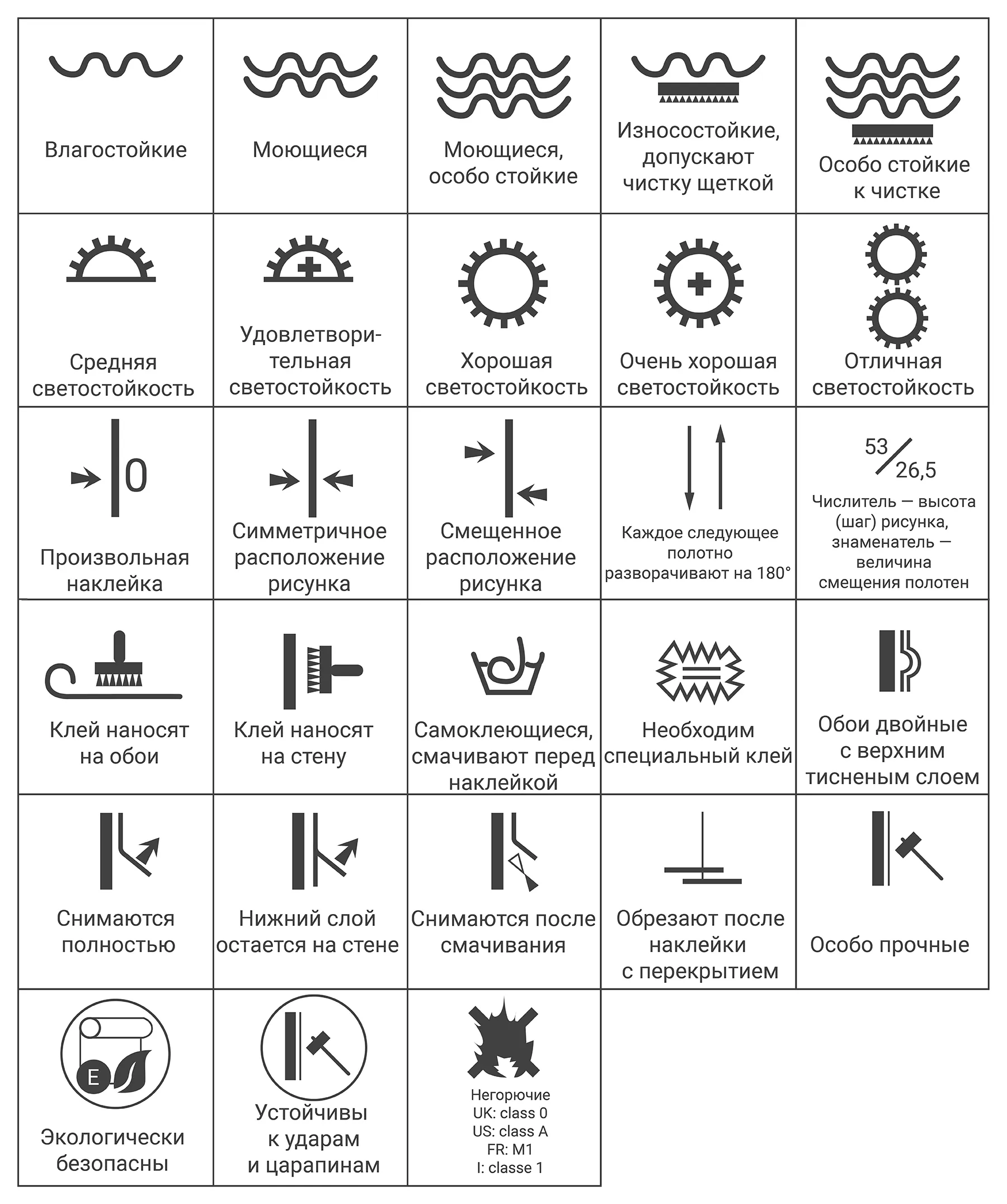 Помимо букв, на этикетке размещают пиктограммы — графические значки, которые дают подробную информацию о покрытии. Эти обозначения расскажут вам о физических характеристиках обоев, например степени чувствительности к свету, воде и повреждениям. Кроме того, маркировка подскажет, как правильно клеить покрытие или снимать со стен.
