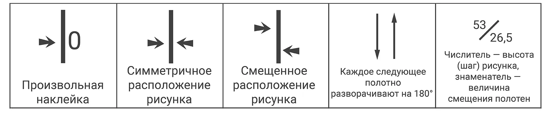 Отметим, что некоторых видов маркировки на упаковке обоев может не быть. Обычно это объясняется отсутствием необходимости. Например, вы можете не увидеть символ подгона по рисунку на однотонных покрытиях.