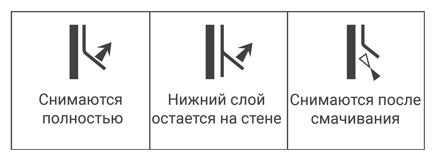 Первое обозначение указывает на то, что полотна легко снять со стены без остатка, смачивать или использовать инструмент не нужно. Если на упаковке стоит третий вариант маркировки, перед снятием полотно нужно намочить, а для удаления использовать инструмент — малярный шпатель.