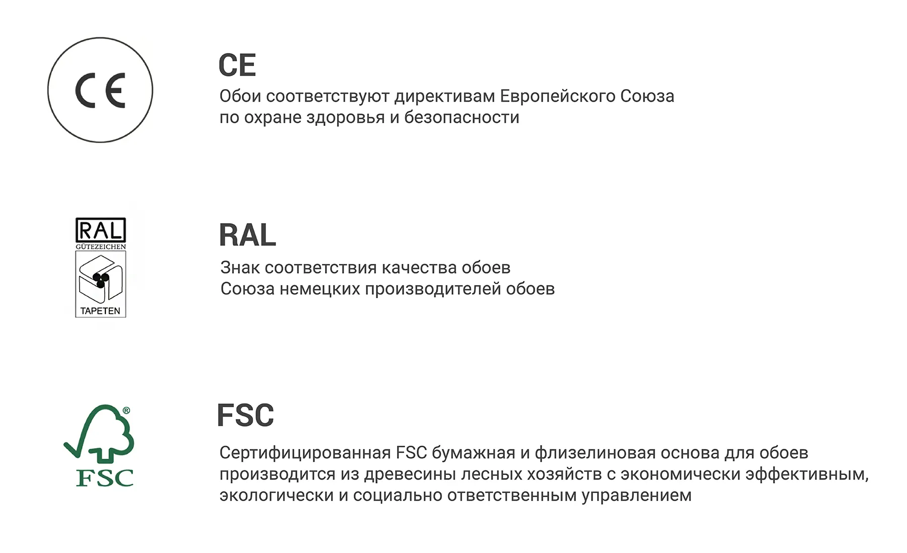 Если продукция изготовлена в странах ЕС, на упаковке ищите знак качества CE. Он свидетельствует о том, что покрытия не нарушают стандарты Евросоюза по охране здоровья и безопасности. Также на упаковке можно встретить значок Союза производителей обоев Германии — RAL. Он тоже указывает на безопасность покрытия для здоровья и среды. А международное обозначение FSC говорит о том, что для производства продукции используют сырье из экологически и социально ответственных лесных хозяйств.