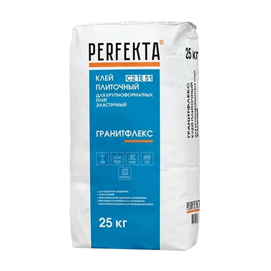- Для крупноформатного керамогранита — 120×60 см и больше — важно подобрать клей с высокой адгезией и пластичностью. Подойдут составы с маркировкой C2 S1 или C2 TE S1. Они удерживают тяжелую плитку, компенсируют подвижки основания и не сползают при укладке. Клей класса C2 S2 в некоторых случаях даже предпочтительнее: он более гибкий, лучше для сложных оснований, выдерживает деформации до 5 мм. S2 хорошо компенсирует значительные колебания основания (деревянные и теплые полы, свежие стяжки). У него обычно более высокая начальная адгезия, что критично для тяжелого керамогранита. Перед покупкой проверьте в инструкции, какой максимальный формат поддерживает конкретный состав — производители указывают это в описании.