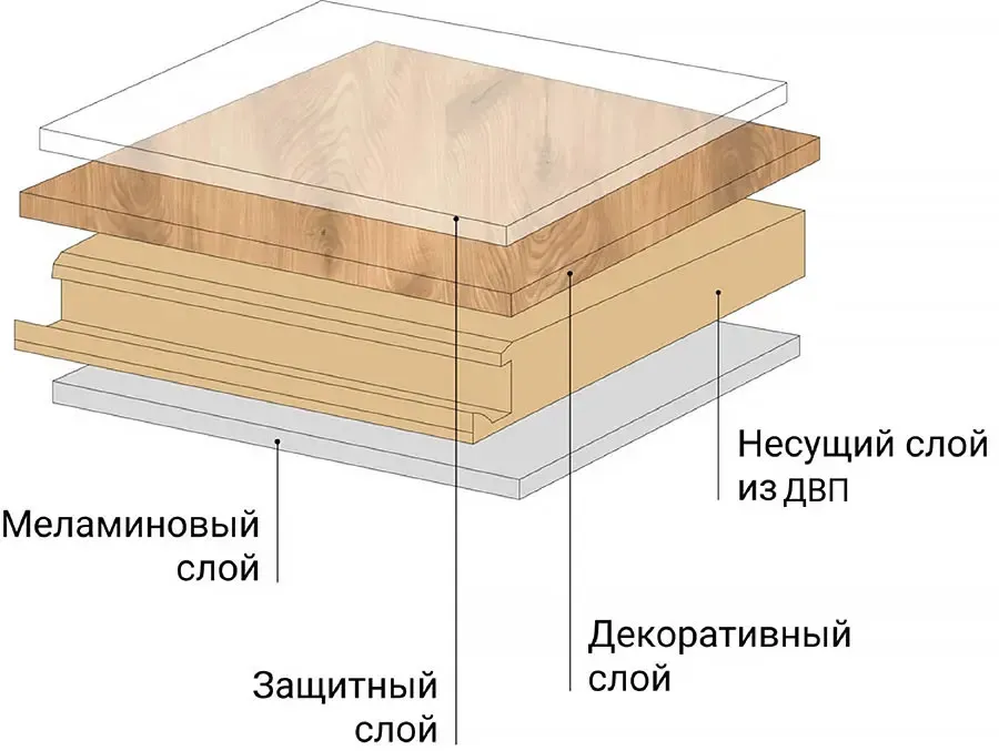 - верхний — прочная меламиновая или акриловая смола, которая защищает поверхность от истирания, выцветания и повреждений