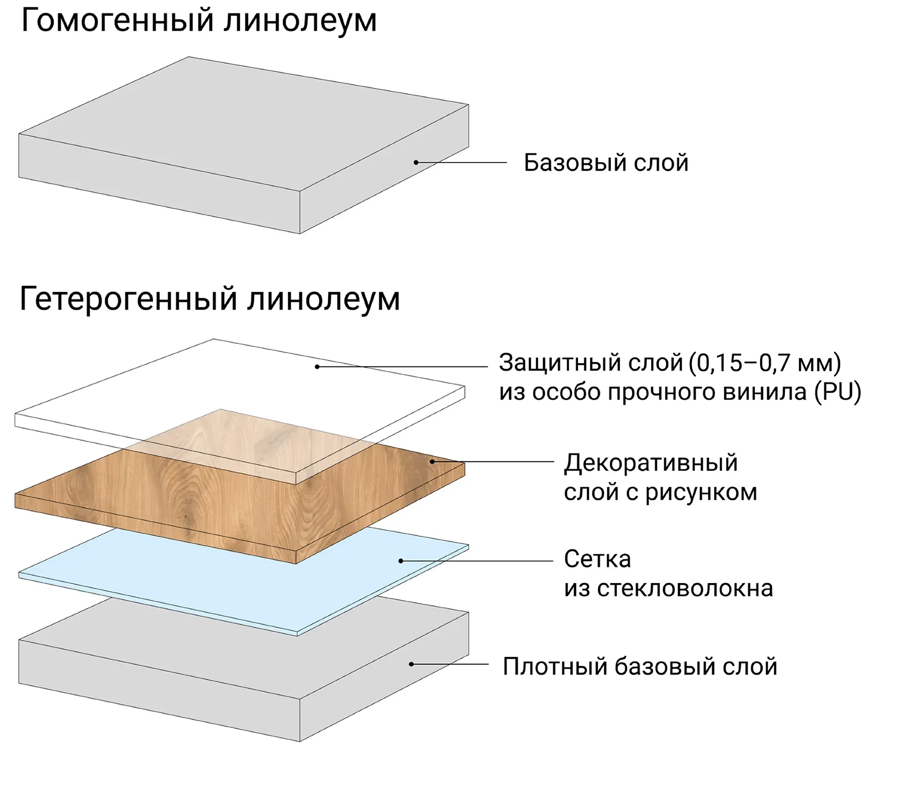 Для жилых интерьеров чаще выбирают гетерогенный линолеум. По составу его делят еще на две разновидности: