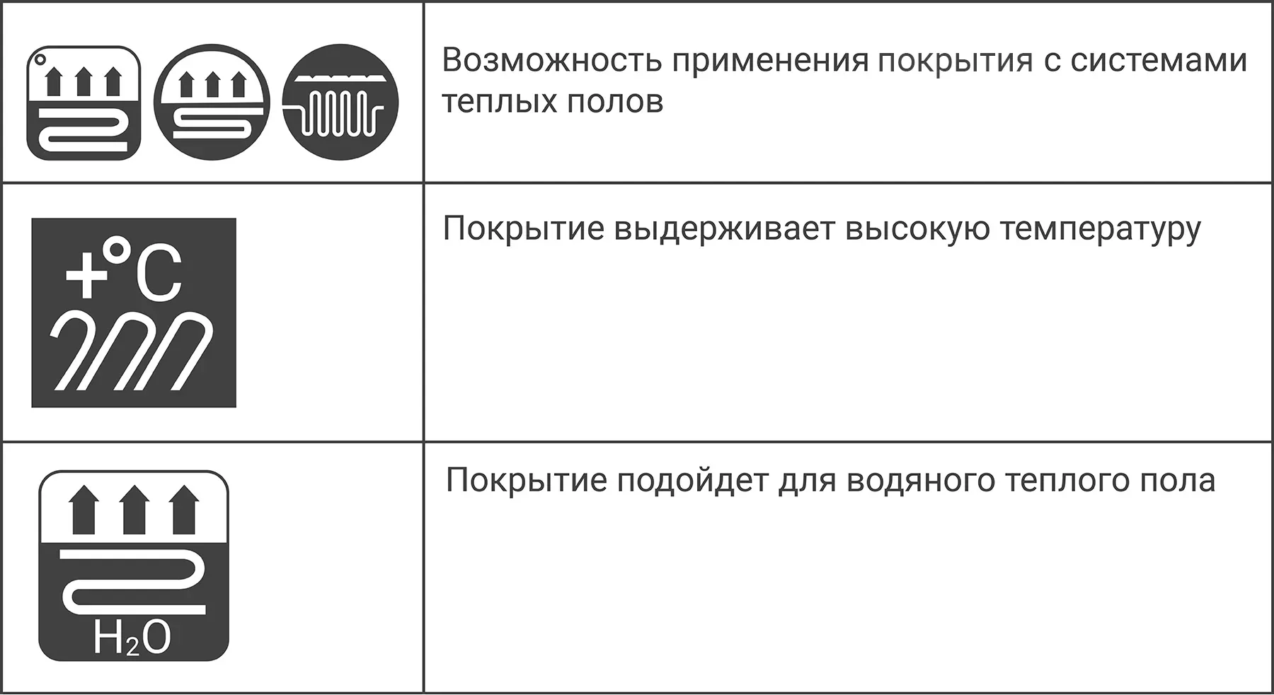 Большинство моделей ПВХ-линолеума выдерживают температуру до +28–30 °C, не теряя форму и цвет. Однако некоторые виды на тканевой или войлочной основе могут пересыхать и деформироваться, поэтому нужно проверять информацию от производителя. Совместимость с теплым полом обозначают текстом или специальными значками.