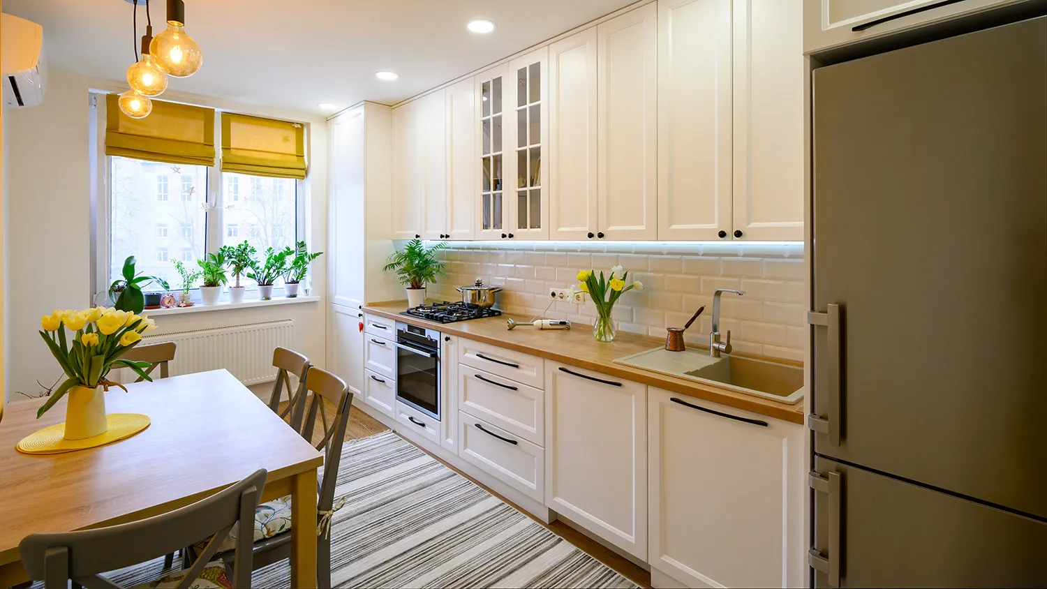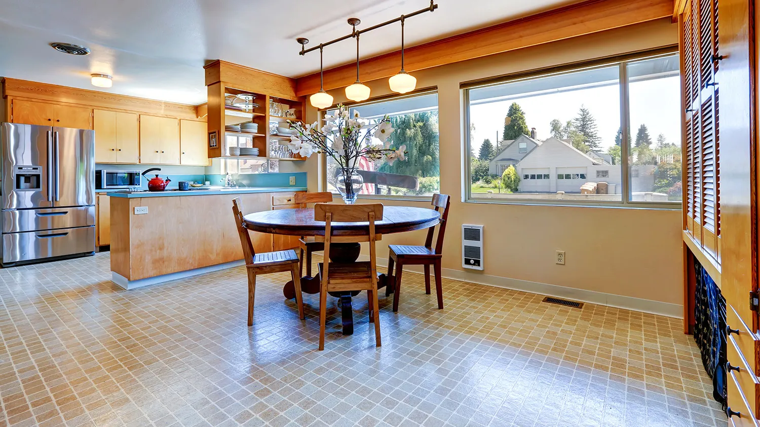 Здесь поверхность подвергается постоянным нагрузкам: от перемещения людей до падения посуды. Зона готовки быстро загрязняется, а влажность повышена. В таких условиях линолеум показывает себя надежнее: он не боится частого мытья с использованием бытовой химии. При этом ПВХ подвиды повторяют фактуру дерева или плитки и подходят для интерьеров в современном стиле.