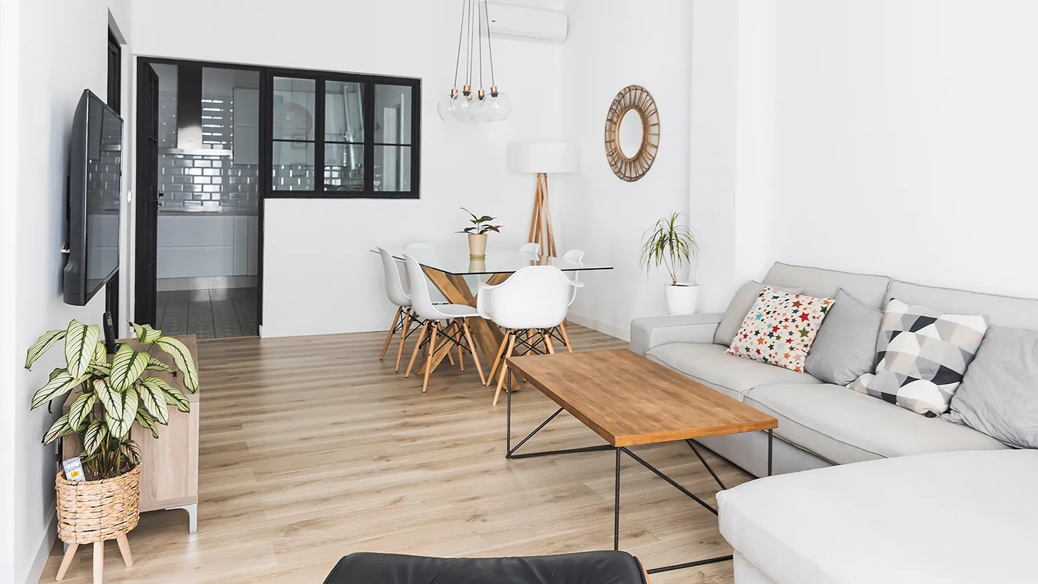 В жилых комнатах важен внешний вид отделки, поэтому ламинат безоговорочно лидирует. Визуально, а иногда и тактильно он приближен к натуральному дереву или камню, можно подобрать покрытие в любом оттенке и с разной фактурой. Для отдельной, не проходной гостиной достаточно 32 класса, для спальни — 31.