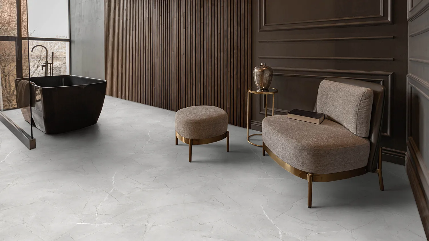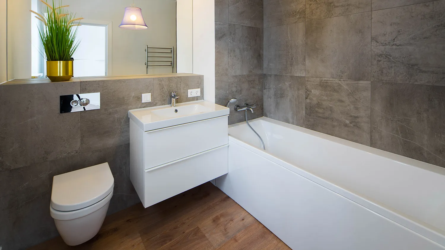 Санузел — помещение с самой высокой влажностью, поэтому здесь чаще применяют керамогранит, керамическую плитку или кварцвинил. Если выбирать между ламинатом и линолеумом, по водо- и влагостойкости выигрывает второй. Лучше всего подходит гомогенный, без подложки. Швы герметизируют, а по периметру устанавливают плинтусы с уплотнителем.
