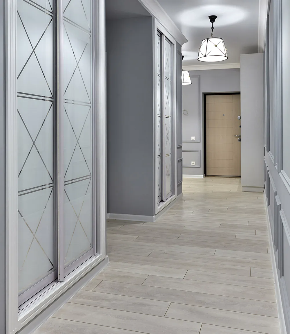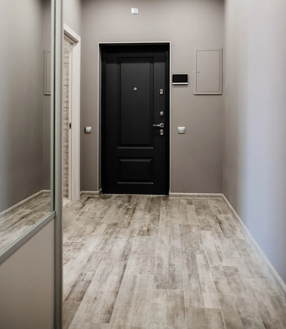 Для прихожей и коридора подходят ламинат 33–34 класса и прочный полукоммерческий линолеум. Материалы можно использовать по отдельности или комбинировать друг с другом для большей практичности. Например, уложить в глубине большого коридора ламинат, а в зоне сразу перед входом — линолеум.