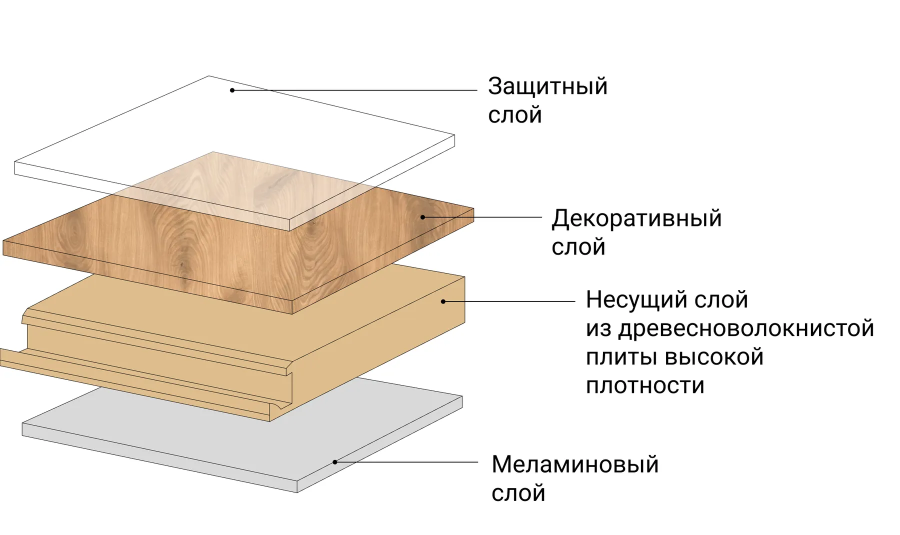 Ламинат — это древесноволокнистая плита высокой плотности (HDF — High Density Fiberboard). Ламинат прессуют под высоким давлением из древесных волокон с добавлением карбамидных смол. Благодаря этому материал получается тверже и плотнее древесины, однако он так же, как и древесина, впитывает влагу, поэтому для ванной комнаты и прихожей не подходит.