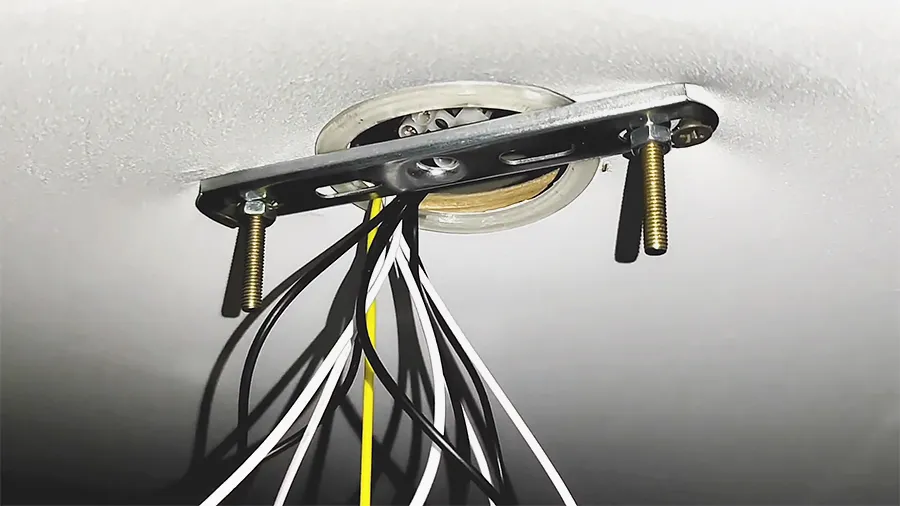 Аккуратно снимите встроенный светильник, освободив отверстие в полотне: надавите на корпус внутрь, слегка сожмите фиксаторы и выньте его из посадочного места. В случае с люстрой сначала снимите декоративный колпак, затем отсоедините крепление от потолочной планки или снимите прибор с крюка ― в зависимости от способа его монтажа. Провода обвяжите изолентой и отодвиньте в сторону.