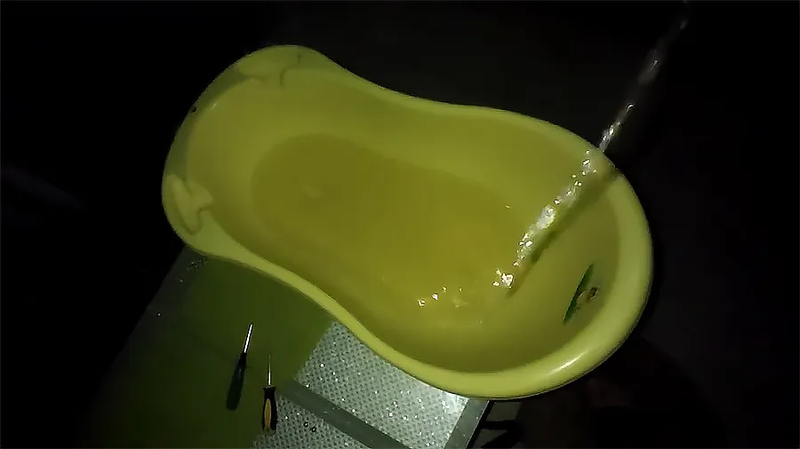 Используйте шланг — он будет выполнять роль направляющего канала, чтобы вода не разбрызгивалась и не залила мебель или пол. Один конец аккуратно вставьте в отверстие, направьте его внутрь пузыря на 2–5 см, чтобы он касался воды. Второй конец опустите в емкость. Чтобы вода потекла, втяните воздух через шланг.