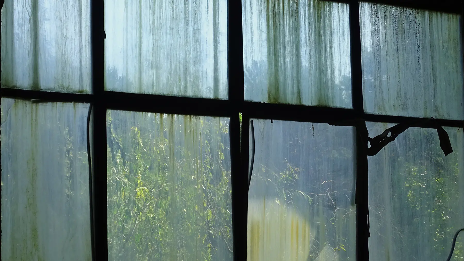 Если на оконное стекло стекает вода с фасадов, на нем образуются нитевидные наросты, под действием которых оно быстро теряет прозрачность. Убрать их практически невозможно — по вертикальной поверхности любое средство стечет быстрее, чем начнет работать. Использовать высококислотные очистители нельзя — они разрушают резиновые уплотнители на окне. Единственный выход — полировка или шлифовка стекла и устранение причины протечки.