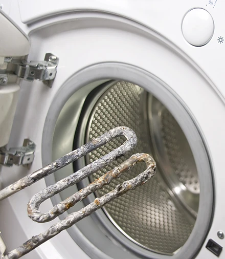 Известковый налет может появиться на резиновой манжете, барабане и в лотках для стирального порошка и отбеливателя. Но опаснее всего, когда он образуется на ТЭНе — в этом случае стиральная машина может выйти из строя. Признаком, по которому можно определить, что на ТЭНе есть отложения, служат следы налета на поверхности барабана.