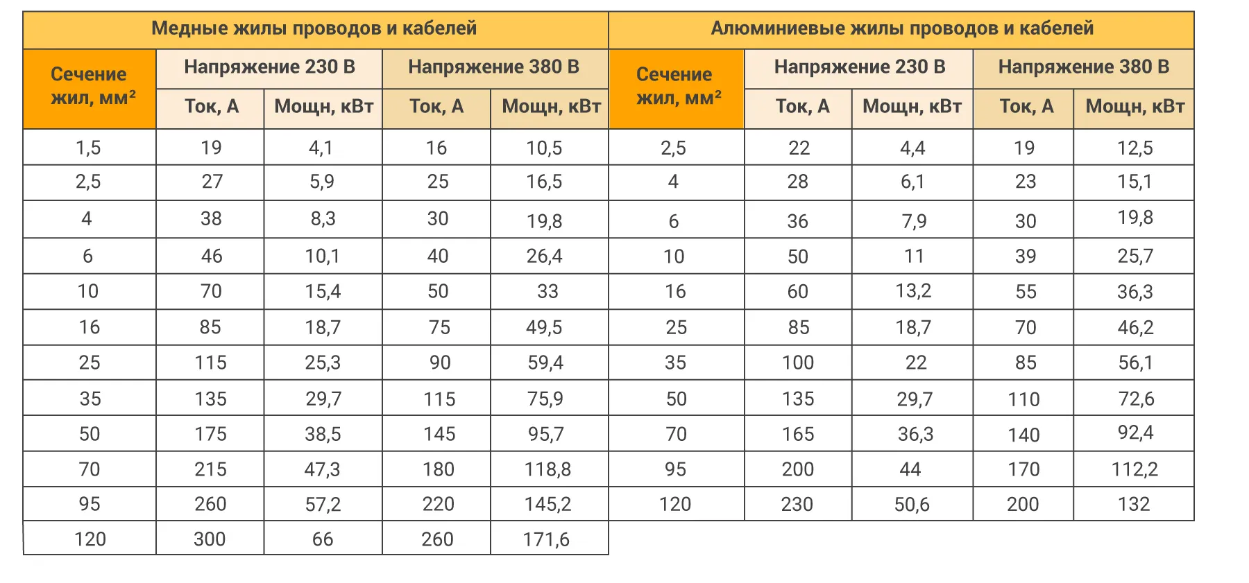 При покупке автомата нужно учесть сечение провода. Этот показатель поможет убедиться, что электрическая проводка выдержит номинальный ток, который вы рассчитали. Можете ориентироваться на таблицу: