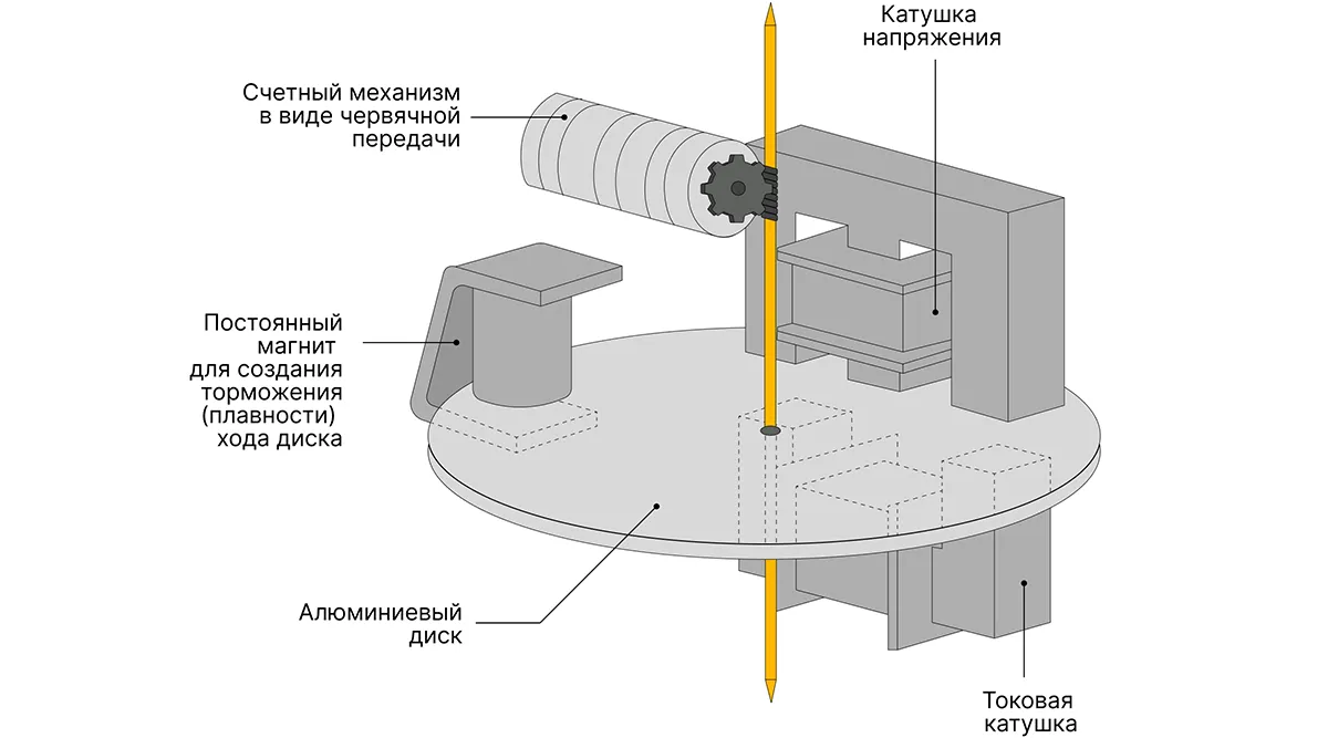 Внутри индукционных (механических) счетчиков установлены две катушки: напряжения и тока, которые создают магнитные поля. Между катушками расположен алюминиевый диск. Когда счетчик включают в цепь, проходящий через катушки ток создает в них магнитное поле, алюминиевый диск начинает крутиться и запускает процесс подсчета киловатт-часов. Чем больше электроприборов подключают к сети, тем выше скорость вращения диска. Каждый поворот диска передается на счетное устройство, с которого считывают показания о том, сколько электроэнергии потрачено.