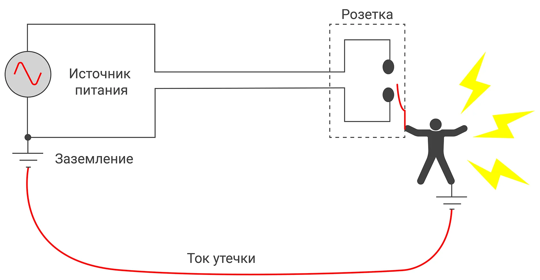Ток утечки — любой непредусмотренный конструкцией прибора электроток. Небольшие утечки из-за крохотной электропроводности изоляционных материалов присутствуют всегда, и это нормально. Опасны аварийные ситуации, при которых через тело человека проходит электричество, способное нанести вред здоровью или даже убить.