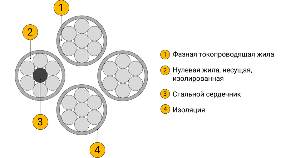 Нулевые жилы могут быть несущими и не несущими. У несущих нулевых жил есть стальной сердечник, который воспринимает вес провода, висящего на столбах. Если нулевая шина не несущая (без сердечника), нагрузка распределяется на все жилы.