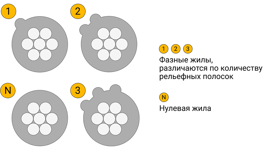 Нулевая жила никак не маркирована. А фазные жилы многожильных проводов обозначаются продольными цветными или рельефными полосками на изоляции. Количество полосок на фазных жилах одного пучка разное — по ним можно отличить одну жилу от другой.
