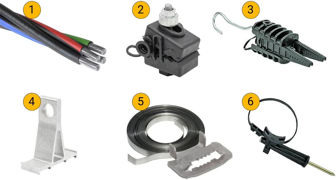 Принадлежности для подключения: 1 — СИП, 2 — ответвительные зажимы, 3 — анкерные зажимы, 4 — анкерные кронштейны, 5 — бандажный комплект, 6 — фасадное крепление. Источник: petrovich.ru