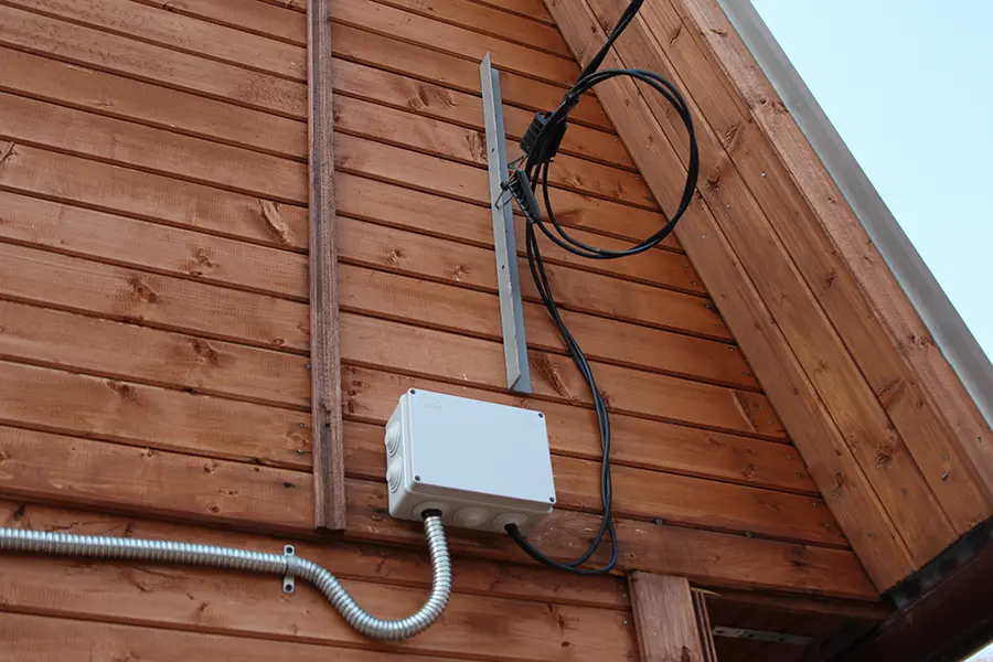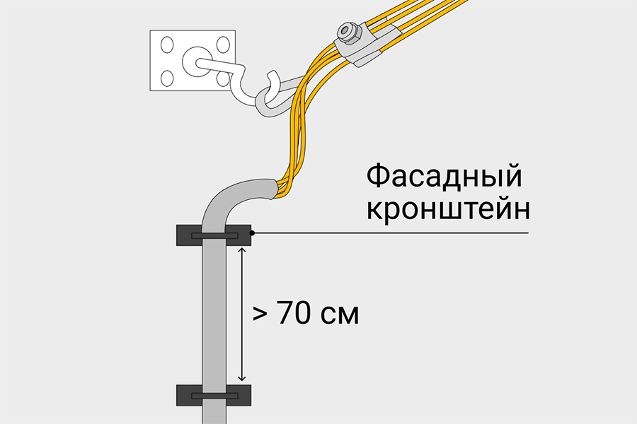 При необходимости с помощью фасадных креплений проложите провод по фасаду до ввода в дом или наружного распределительного щитка. Крепления устанавливайте с интервалом не больше 70 см.