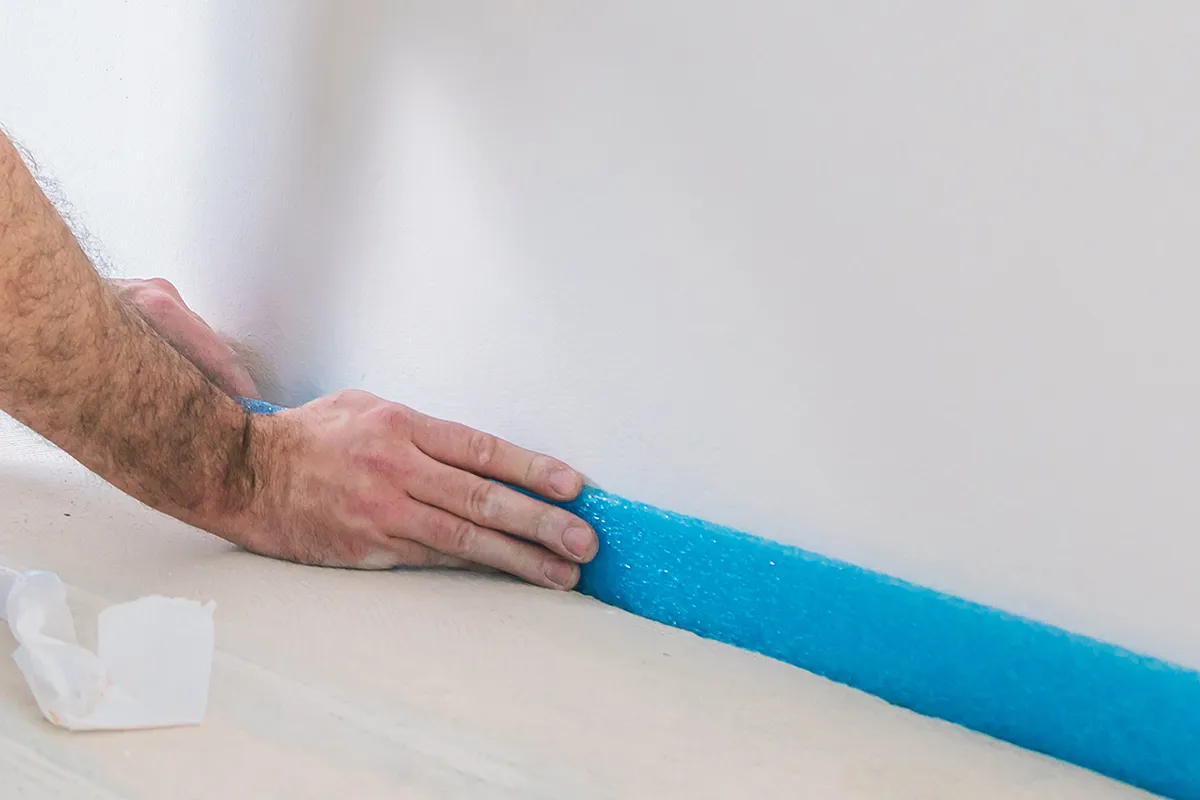 Пока грунтовка «отдыхает», обклейте низ стен по всему периметру помещения малярной или демпферной лентой, чтобы не запачкать стены смесью для пола.